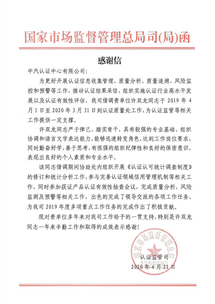 2020年4月21日,认证监督管理司对中汽认证发来感谢信,对中汽认证多年给予的一贯支持及许双龙同志一年来辛勤工作和取得的成效表示感谢。