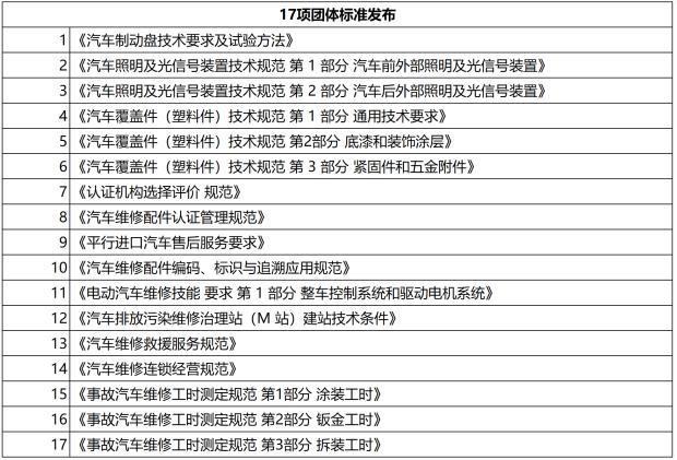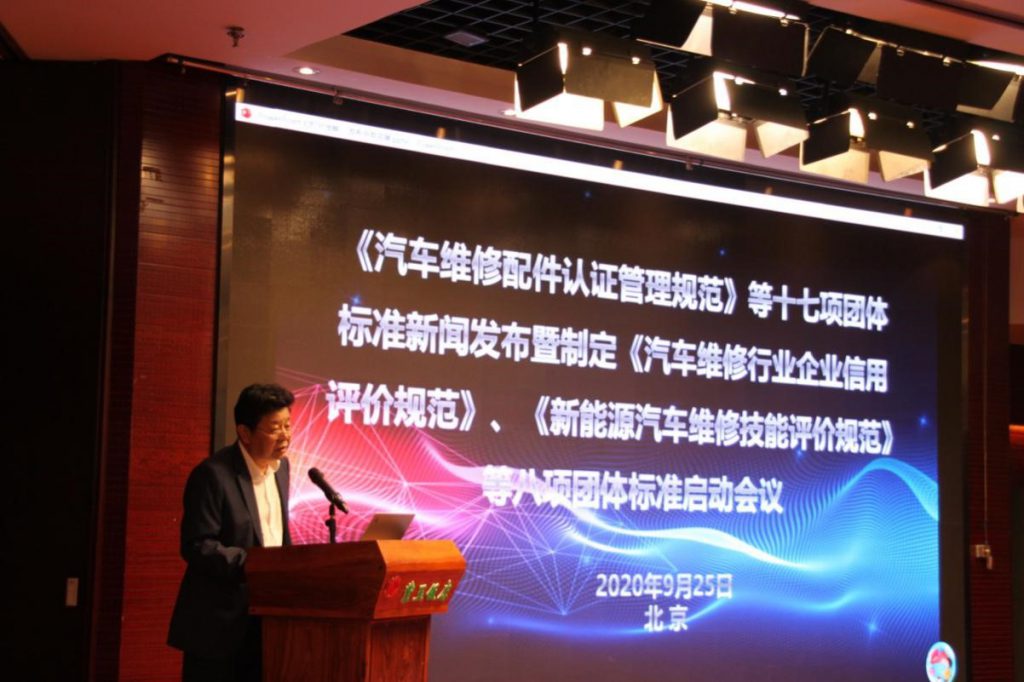 由中机寰宇认证检验有限公司(中汽认证中心有限公司)牵头起草的《新能源汽车维修人员技能评价规范》、《新能源汽车售后服务规范》、《汽车维修行业企业信用评价规范》、《汽车维修行业大气污染物排放控制规范》 、《二手车出口质量要求》、《汽车总成零部件再制造供应商选择评价规范》等八项团体标准制定工作也在同步启动。