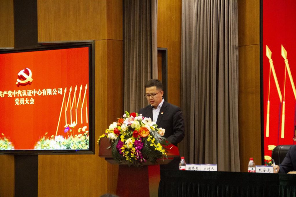 11月12日,中共中汽认证中心有限公司(以下简称:中汽认证)总支委员会召开党员大会。中机寰宇认证检验有限公司(以下简称“中机认检”)党委书记、副总经理牛海军,中机认检董事长、总经理、党委委员付志坚应邀出席会议,会议由中汽认证党总支书记陈晓东主持,中汽认证全体党员参加了会议。