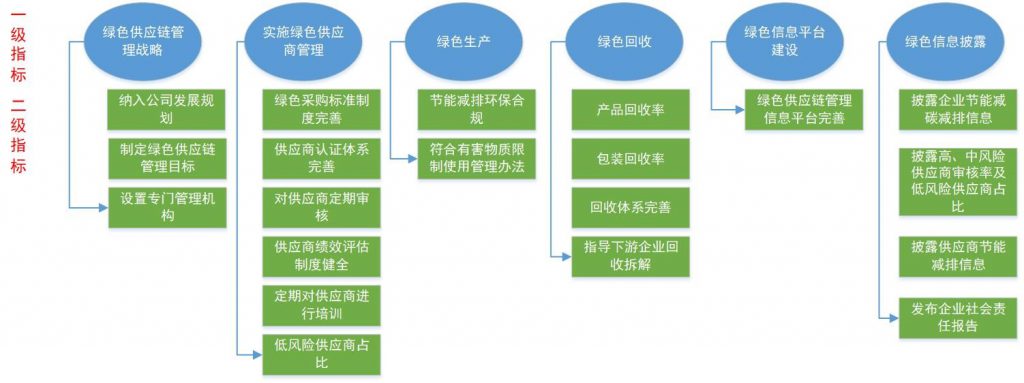绿色供应链:以汽车、电子电器、通信、机械等行业龙头企业为依托,以绿色供应链标准和生产者责任延申制度为支撑,带动上下游企业在保证产品质量的同时践行环境保护责任,构建以资源节约、环境友好为导向,涵盖全部环节的绿色供应链。绿色供应链侧重供应链节点上企业的协调与协作。按照工信部评价要求,绿色供应链评价分为7项一票否决制性质的一般要求符合性评价(比如具有独立法人资格)和申报绿色供应链的具体要求,共分为6个一级指标和20个二级指标,二级指标的指标类型又分为定性和定量。申请流程同绿色工厂评价流程。评价模式:自评价报告+第三方评价报告。