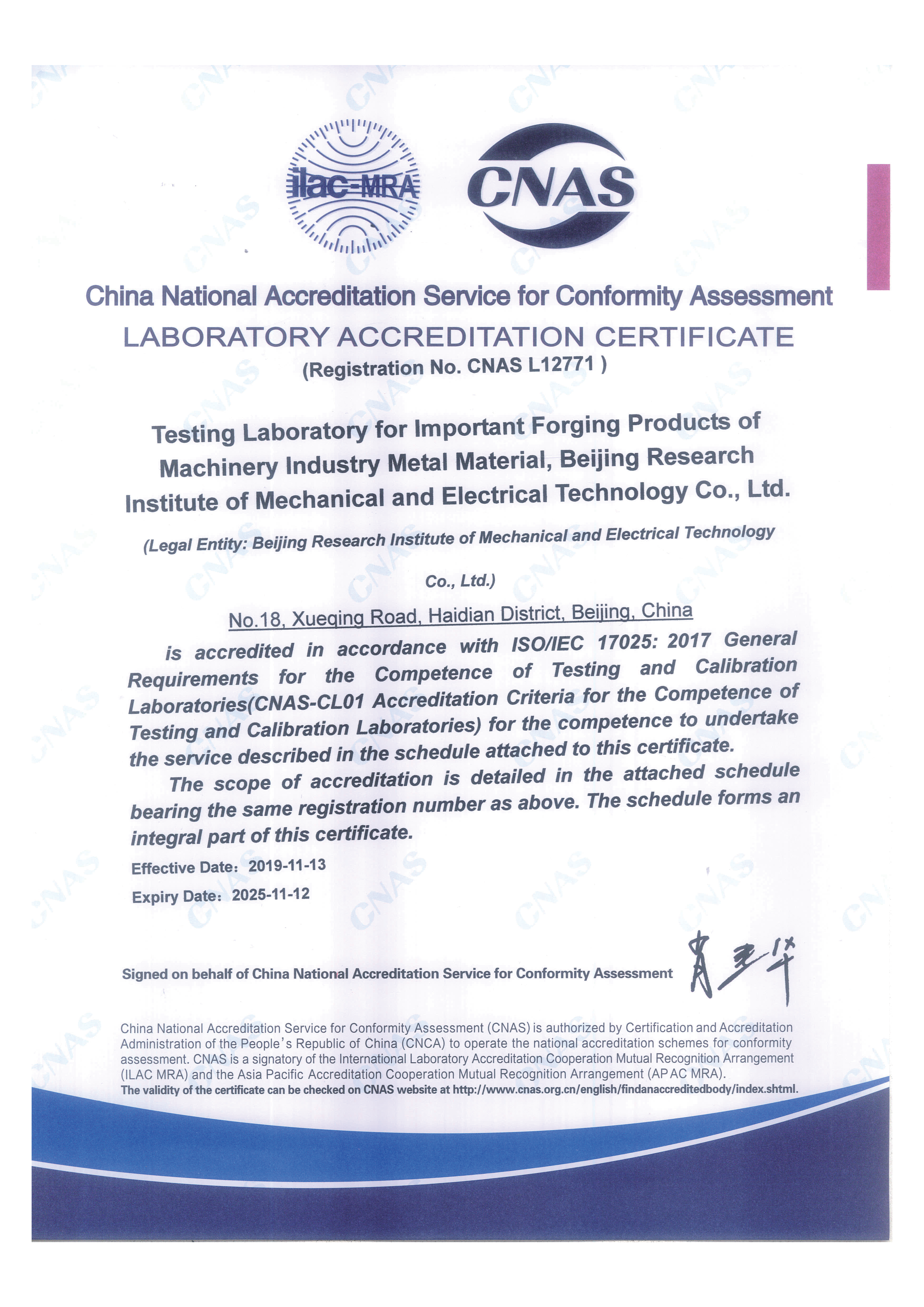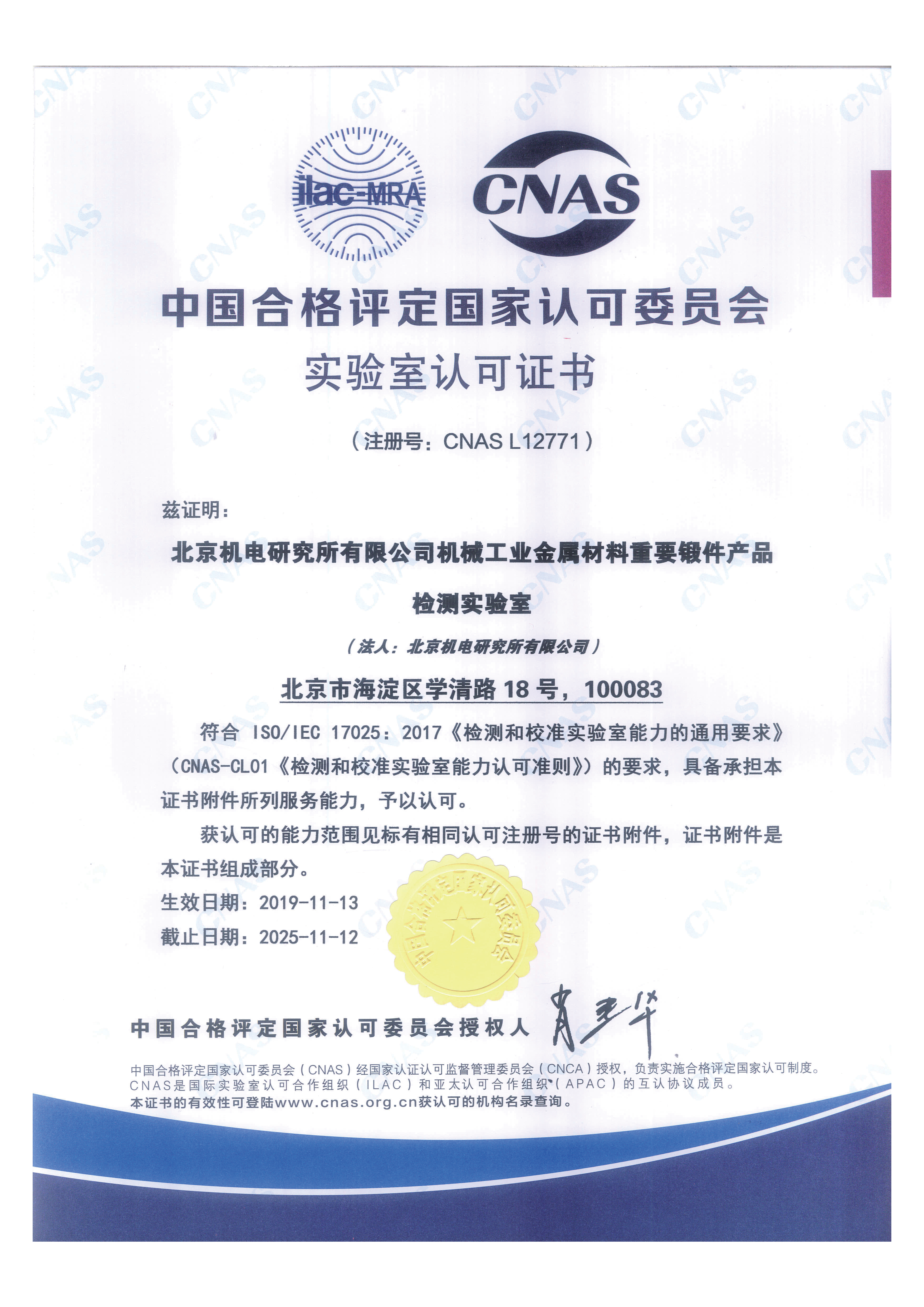 北京机电研究所有限公司机械工业金属材料重要锻件产品检测实验室于2019年11月13日,获得中国合格评定国家认可委员会(英文缩写为:CNAS)认可资格, 本次认可检测能力涵盖拉伸、冲击、硬度、渗碳层组织及深度评定、显微组织检测及晶粒度评级等8项国家标准。实验室可在认可的检测能力范围内,使用CNAS国家实验室认可标识和ILAC国际互认联合标识。