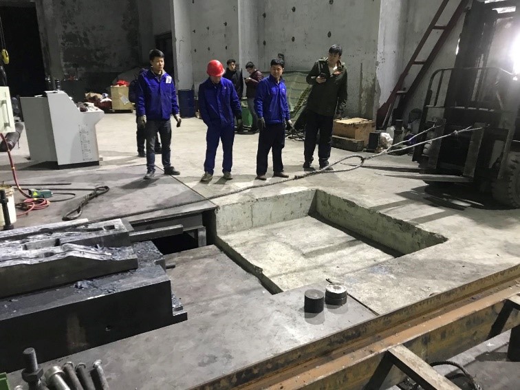 2019年12月中旬,用户的主压力机安装完成,车间的地坪、水电气尚未完全到位,锻压中心已安排项目组人员赶赴车间现场,并即刻组织车间相关人员展开了全线安装调试工作,由于时间紧迫,为了实现一月份的产量目标,项目组五位党员发挥先锋模范作用,带领项目人员经常加班到凌晨两三点,并抓紧工作间隙对车间操作人员进行培训。