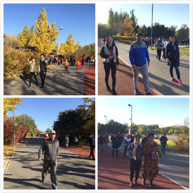 在奥森公园南门集体合影留念后,长走活动正式开始。10月底的北京已有几分寒意,但阻挡不了广大员工的健身热情。奥林匹克森林公园秋意渐浓,在秋日阳光的照耀下,金黄的银杏树美不胜收,沿途的火炬树叶大多已经变成了迷人的红色,步行道旁盛开着美丽的野花,行走之时使我们深深感觉到一种美的享受,让大家在行走间享受运动的乐趣,在欢声笑语中交流工作、畅谈生活。此次活动很多职工都是乘坐公交(地铁)或骑车到达活动现场,响应了国家绿色环保出行的理念,达到了使广大职工们亲近自然、愉悦身心、增进健康、促进交流的理想效果。