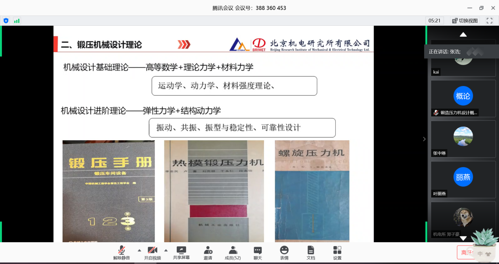 5月7日,我所副总工程师、博士生导师、正高级工程师张浩开启课程第一讲,他的课程题目为“锻压机械设计概论”,张总由浅入深的通过图纸分析、视频演示等多种多样地方式生动的为大家解读了锻压机械设计理论、计算方法以及设计要点等专业内容。课程结束后,大家结合自身问题,针对课程内容,同张总进行了线上交流与沟通,直播课程在科研交流中圆满结束。