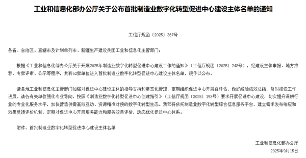 近日,工业和信息化部发布全国首批制造业数字化转型促进中心建设主体名单,由北京机械工业自动化研究所有限公司牵头组建的联合体成功入选。