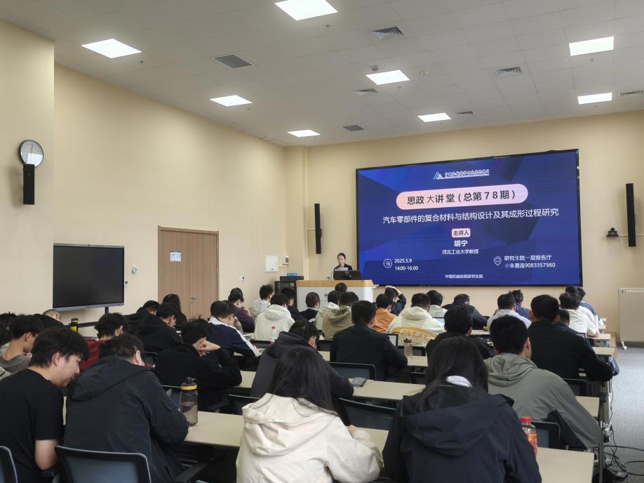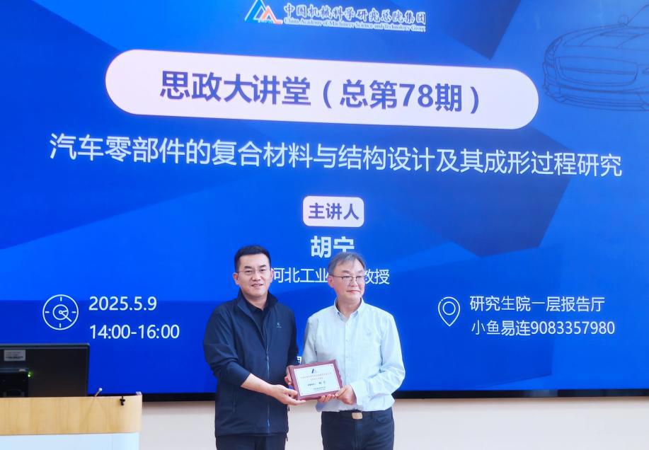 2025年5月9日,中国机械总院2025年第三期(总第78期)思政大讲堂成功举办。本期讲堂特邀河北工业大学原副校长、杰青、教授、博士生导师胡宁担任主讲嘉宾,围绕“汽车零部件的复合材料与结构设计及其成形过程研究”以及“如何高质量开展科研”展开学术分享。活动采用线上线下结合的方式,近70名研究生参加。