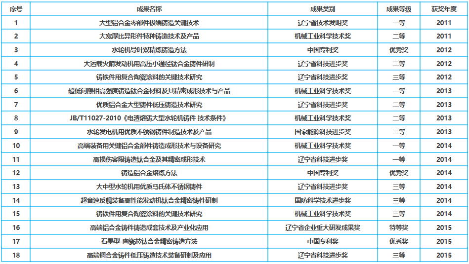 建所以来,本所承担了众多国家科技项目和国防军品配套项目,至今已取得科研成果600余项,其中国家级奖励18项、省部级奖励214项,拥有有效授权专利48项,其中发明专利42项。组织制修订铸造专业国家标准和行业标准近300项,其中主持和参与起草的铸造国家标准和行业标准137项,为我国铸造行业工艺水平的提高、装备水平的升级和技术进步提供了技术支撑。