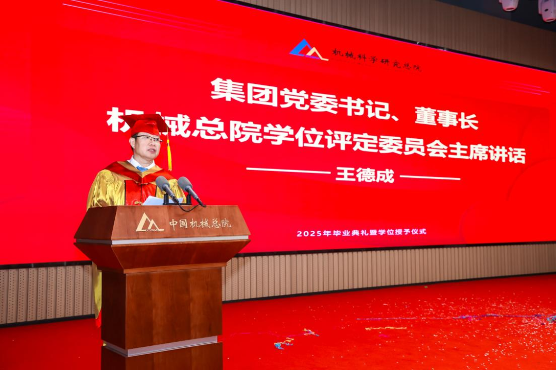 机械总院学位评定委员会主席、集团党委书记、董事长王德成,集团党委副书记、总经理孟祥宇,集团党委副书记、董事李玉鑫,集团党委委员、副总经理王宇,机械总院学位评定委员会副主席、集团副总经理李爱国,集团副总经理姜超出席典礼,机械总院学位评定委员会委员、京内外各二级单位领导、导师代表、研究生管理部门负责人、2025届毕业生及家属共计190余人齐聚一堂,共同见证这一重要时刻。典礼由机械总院学位评定委员会秘书长、研究生院副院长边翊主持。