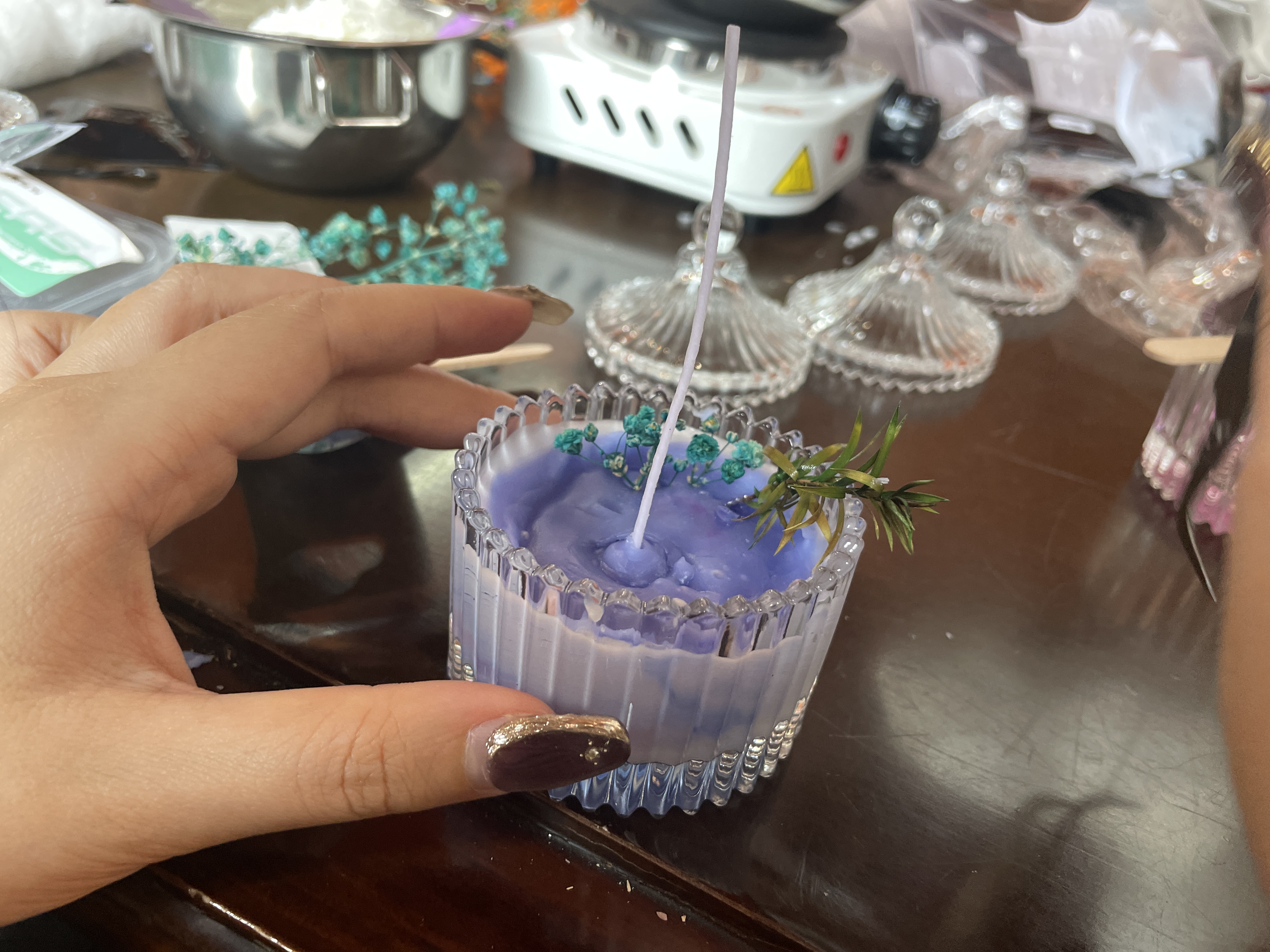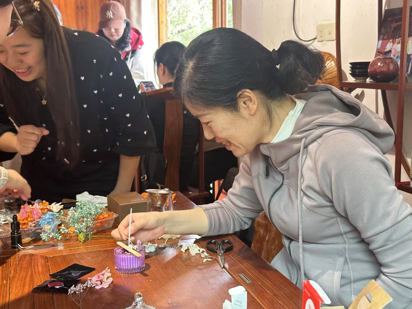 下午,手工制作活动更是激发了大家的创造力和动手能力,DIY香薰蜡烛和干花团扇为活动增添了艺术气息。