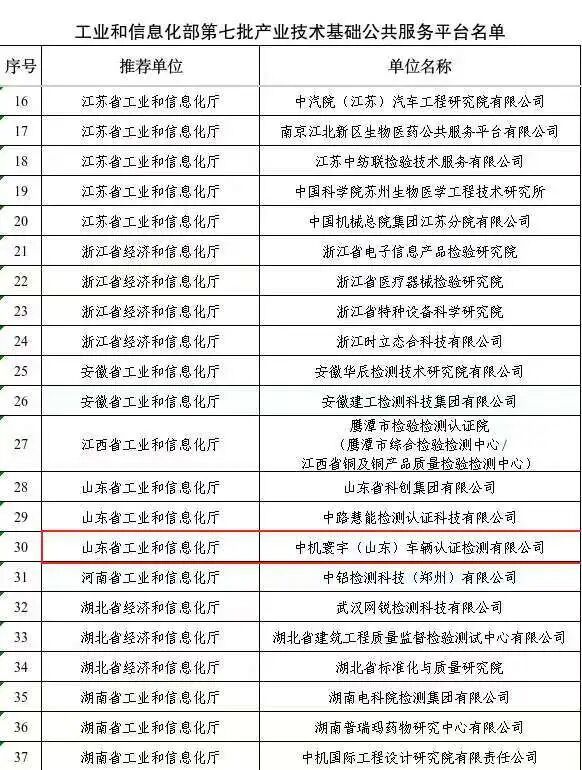 喜报|中机寰宇(山东)车辆认证检测有限公司获评工信部产业技术基础公共服务平台