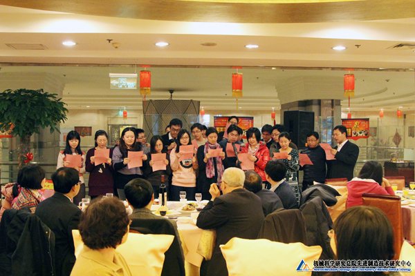 九九祥云舒玉免,千千情结系金龙。研究中心2012年迎新春晚宴于2012年1月17日在湘水之珠隆重举行。研究中心全体干部员工欢聚一堂,共同为新的一年举杯庆祝。机械总院李新亚院长、机械总院工会王晓明主席、陈蕴博院士和研究中心单忠德主任出席本次晚宴。晚宴由王淼辉和乔娟娟共同主持。