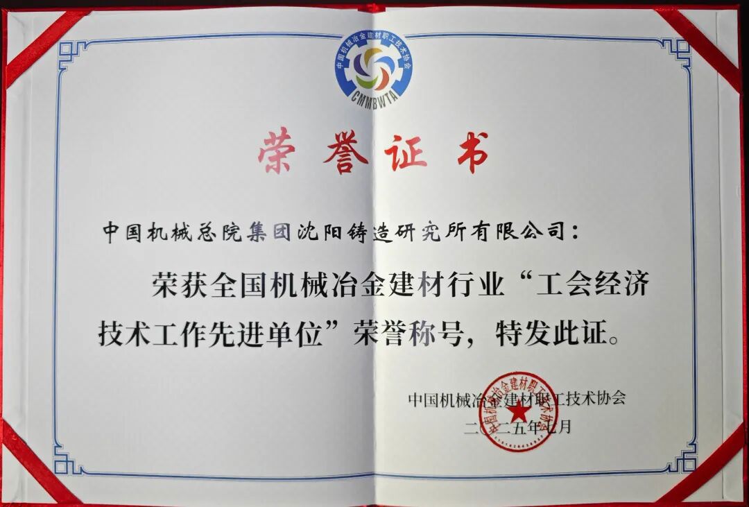 喜报!中国机械总院沈铸所荣获全国机械冶金建材行业“工会经济技术工作先进单位”荣誉称号