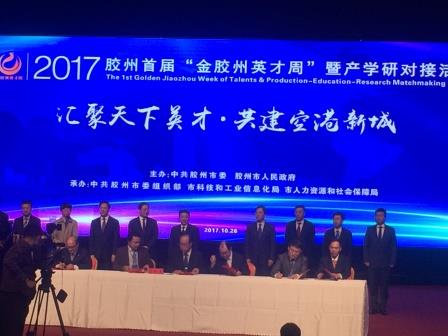 10月26日,“金胶州英才周”暨产学研对接活动在胶州市会议中心正式启动。此次会议开幕式由胶州市委毕维准副市长主持,胶州市委孙永红书记、青岛大学李军副校长、青岛市委组织部吴学新副部长分别致辞。青岛分院孙振田副院长、李永栋等代表青岛分院参加系列活动。