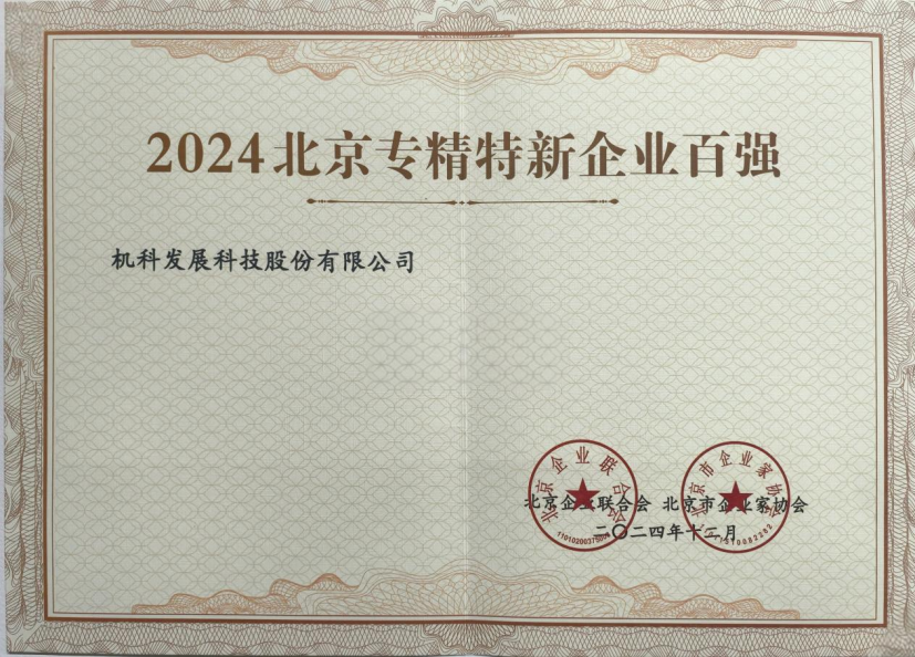 机科股份继2023年获得“北京市高精尖企业百强”、“北京市专精特新企业百强企业”荣誉称号后,再次喜获“北京市专精特新百强企业”荣誉。这是北京市政府、行业协会对机科股份成立20余年主动践行高精尖、专精特新装备高质量发展的高度肯定,更是对公司推动实体经济持续向好发展担当作为的充分肯定。未来,机科股份继续聚焦主责主业、加强应用基础技术自主创新,为加快建设世界一流创新型企业而努力奋斗。