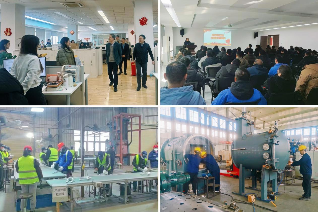 “只争朝夕”加油干。浓浓年味还未散去,机电所人早已蓄势待发,奔赴各自岗位。中机精成坚持春节期间不停工,一线工人争分夺秒有序作业,党员骨干带头支援高效协作,确保产品高标准交付。中机精冲大年初四提前开工,全自动精冲生产线高速运转,首批精冲件已发往欧洲,在国际市场上迈出承载机电所“精益求精”品质的坚实步伐。中机锻压召开动员大会,全体员工以更饱满的热情、更严谨的态度投入到锻压工业母机转型升级中。中机真空第一时间组织“开工第一课”学习,检修调试机器,把好安全“第一关”,拉满生产“进度条”,向着目标全力奋进。