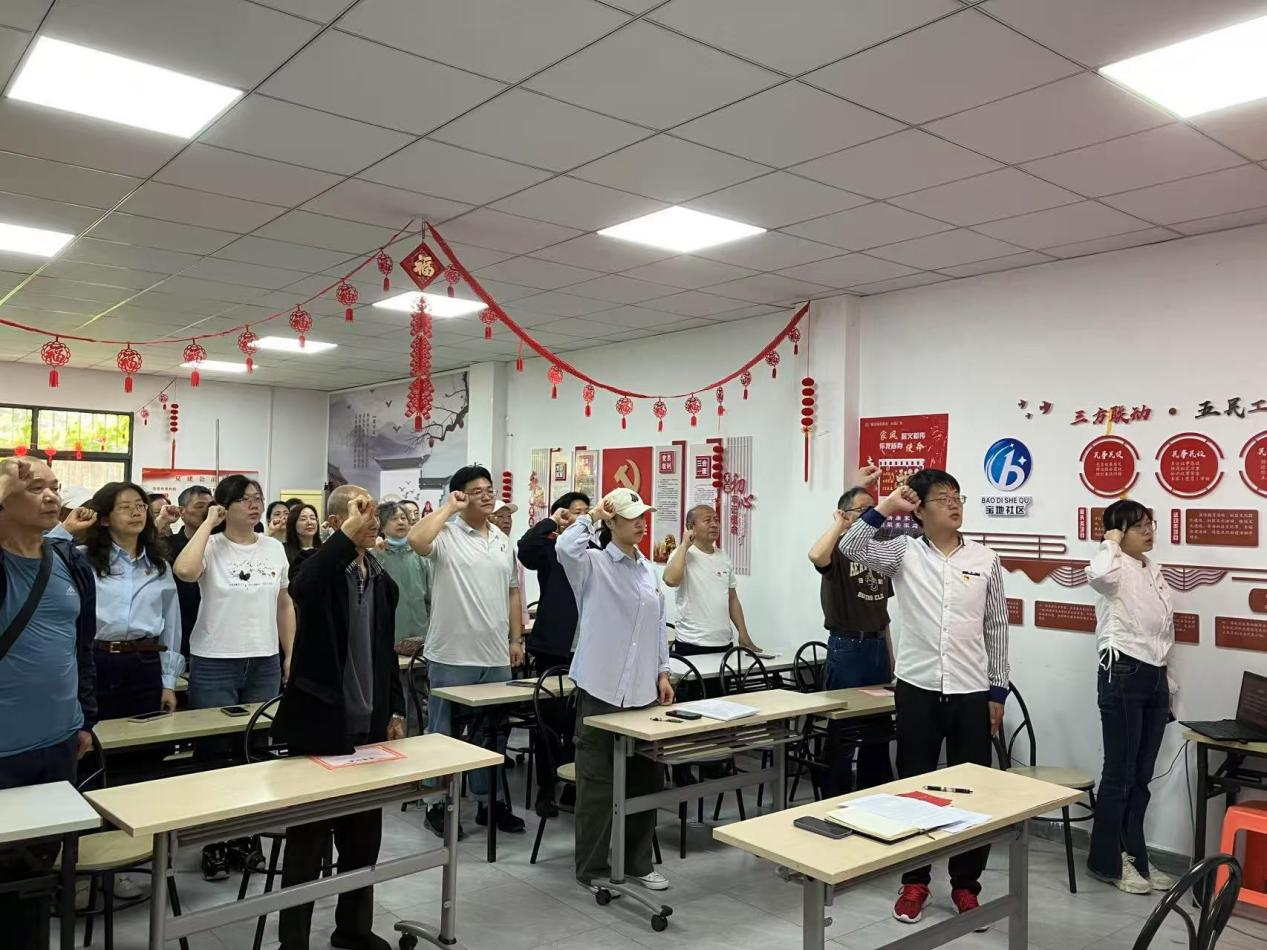 活动伊始,全体党员现场缴纳党费,以行动践行义务,彰显“党费姓党”的政治自觉。随后,宝地社区党委书记王翔领誓,全体党员面向党旗庄严宣誓。80字的入党誓词字字铿锵,既是共产党人初心使命的集中表达,更是新时代党员对党忠诚、永葆本色的政治宣言。通过仪式教育,进一步强化了“第一身份是党员、第一职责是为党工作”的政治认同,为基层党建注入精神动能。