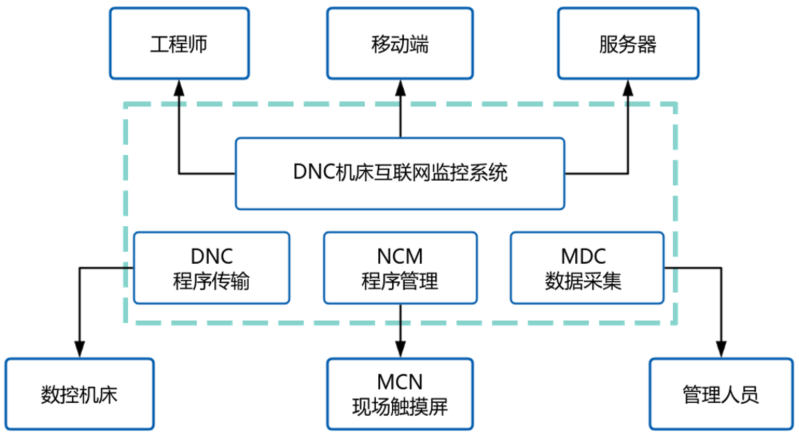 为企业搭建车间设备联网管理平台,设备统一联网管理,支持数控设备的在线加工,系统通过无线通讯模块和数据处理能力,对车间数控机床和其他智能设备的运行数据进行实时采集,实现对设备的实时状态监视与控制,并对生产数据进行分析及处理,为其他信息化软件(MES、ERP系统)提供数据支持。