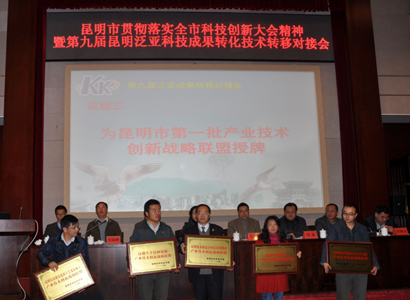 近日,由云南省机械研究设计院牵头申报的“昆明市装备制造企业信息化推进产业技术创新战略联盟”,成功通过了昆明市科学技术局组织的评审,于10月29日在昆明市呈贡新区市级会议中心召开的昆明市贯彻落实全市科技创新大会精神暨第九届昆明泛亚科技成果转化技术专业对接会上获得了科技局刘燕琨局长的亲自授牌,成为昆明市首批认定并授牌的五个产业技术创新战略联盟之一。