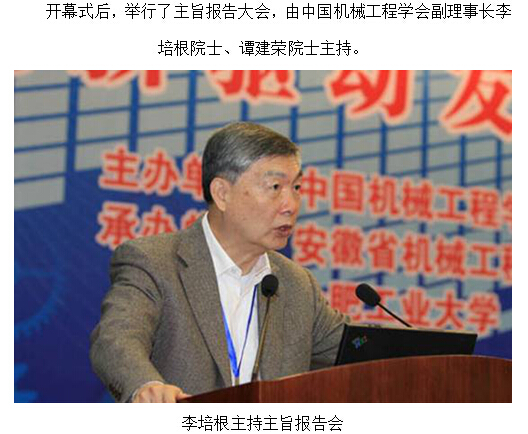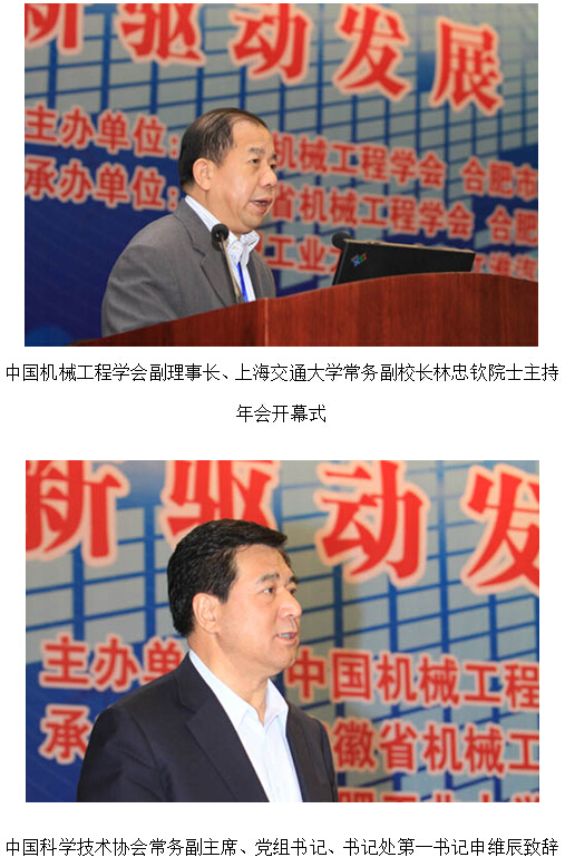 由中国机械工程学会、合肥市人民政府主办,安徽省机械工程学会、合肥通用机械研究院、合肥合锻机床有限公司、合肥工业大学、安徽江淮汽车集团有限公司、安徽叉车集团有限公司联合承办的2013年中国机械工程年会于2013年11月5日—7日在安徽合肥隆重举行,全国人大常委会原副委员长、中国机械工程学会荣誉理事长路甬祥院士,中国工程院院长、中国机械工程学会理事长周济院士出席会议并作主旨报告。本届年会以“创新驱动发展 建设制造强国”为主题,精彩的主旨报告及丰富多彩的专题活动吸引了来自全国各地的近千名机械科技工作者参加。 11月6日在合肥稻香楼宾馆东楼礼堂举行了隆重的年会开幕式及颁奖典礼。大会开幕式由中国机械工程学会副理事长、上海交通大学常务副校长林忠钦院士主持,中国科学技术协会常务副主席、党组书记、书记处第一书记申维辰,中共合肥市委常委、常务副市长韩冰,到会并致辞。出席会议并在主席台就座的还有:中国机械工程学会监事长宋天虎,中国机械工业联合会执行副会长薛一平,中国机械工程学会副理事长卢秉恒、包起帆、李培根、李新亚、杨海成、张彦敏、郭东明、蔡惟慈、谭建荣,中国机械工程学会监事王玉明、朱森第、李忠海,中国机械工程学会特邀理事温诗铸,安徽省科协党组书记、常务副主席周建强,安徽省科协副主席、 安徽省机械工程学会理事长刘光复,中国机械工程学会荣誉会员、香港安乐工程集团主席潘乐陶,台湾上银科技股份有限公司董事长卓永财,中国机械工程学会常务理事、安徽省机械工程学会常务副理事长陈学东,安徽省机械工程学会副理事长、合肥合锻机床有限公司董事长严建文,安徽省机械工程学会副理事长、合肥工业大学副校长吴玉程。