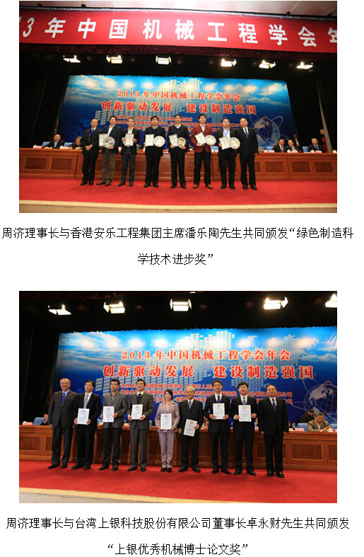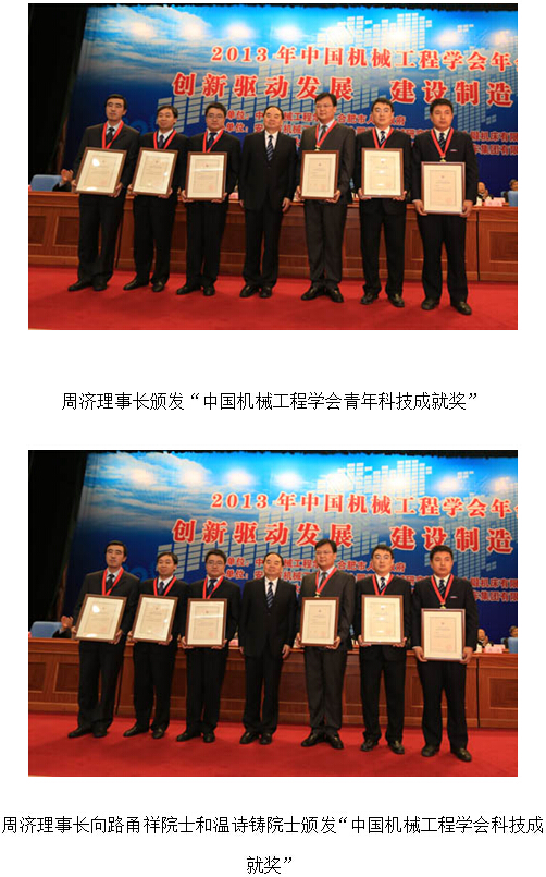 大会开幕式上举行了隆重的颁奖仪式,周济理事长等嘉宾分别向“中国机械工业科学技术奖”、“第3届绿色制造科学技术进步奖”、“第3届上银优秀机械博士论文奖”、“中国机械工程学会青年科技成就奖”和“中国机械工程学会科技成就奖”的获得者代表颁奖。