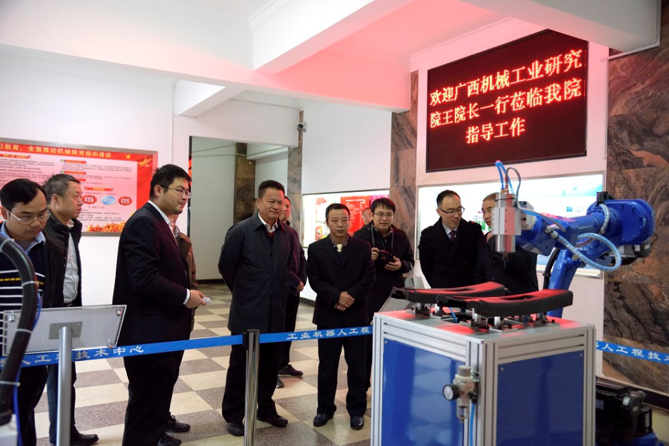 2016年1月7日广西机械工业研究院王吉才院长、吴湘宁副院长、霍力副院长、岑贤生院长助理、张培铭主任一行五人到我院参观、交流、座谈,讨论如何加强合作、开拓市场,探讨双方在《中国制造2025》及“工业4.0”背景下如何加强智能制造,特别是在工业机器人研究应用、3D打印等领域的合作。