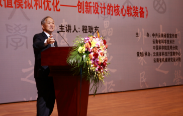 2016年4月26日下午,“云南科学大讲坛”第62期在云南大学科学馆举行。中国科学院院士、俄罗斯科学院外籍院士、国际结构与多学科优化学会主席程耿东先生作为主讲嘉宾,作了题为《数值模拟和优化——创新设计的核心软装备》的报告。本期讲坛由云南省机械研究设计院与云南省科技厅宣教中心共同策划、承办。云南省机械工业行业协会周建中秘书长、云南省机械研究设计院施庆华院长、张东宁书记、张永宁副院长出席了本次讲坛并陪同程院士在前排就坐。