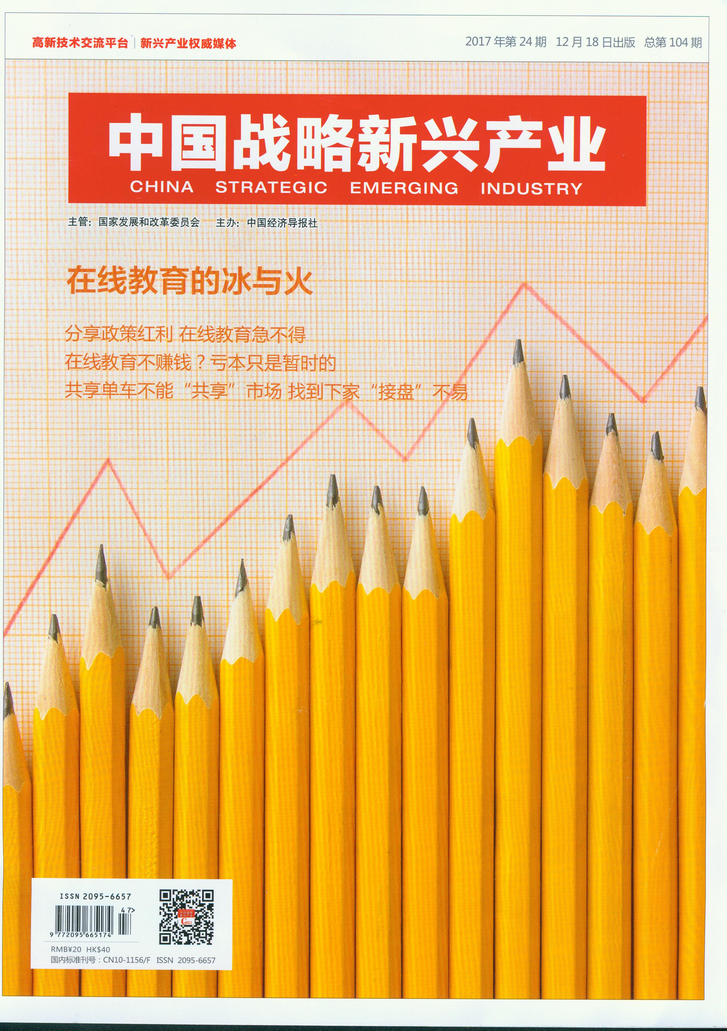 《中国战略新兴产业》杂志由国家发改委主管,中国经济导报社主办,是全国唯一专业分析和集中报道战略新兴产业发展的新闻期刊。国家发改委、工信部、科技部、环保部、中国工程院、中国科学院等领导对杂志在宣传国家战略新兴产业的政策和法规,报道战略新兴产业领域内的新成就和新经验等深为认可并予以支持。已成为国家高层关切行业动态的窗口,更是企业高管、各级党政决策层、经济发展及科学技术研究机构暨专家学者等高端受众群体瞩目的咨询宝库和产业发展交流平台,已走进英国、法国、智利、巴西等国驻华大使馆、领事馆,成为畅通中外的信息桥梁。