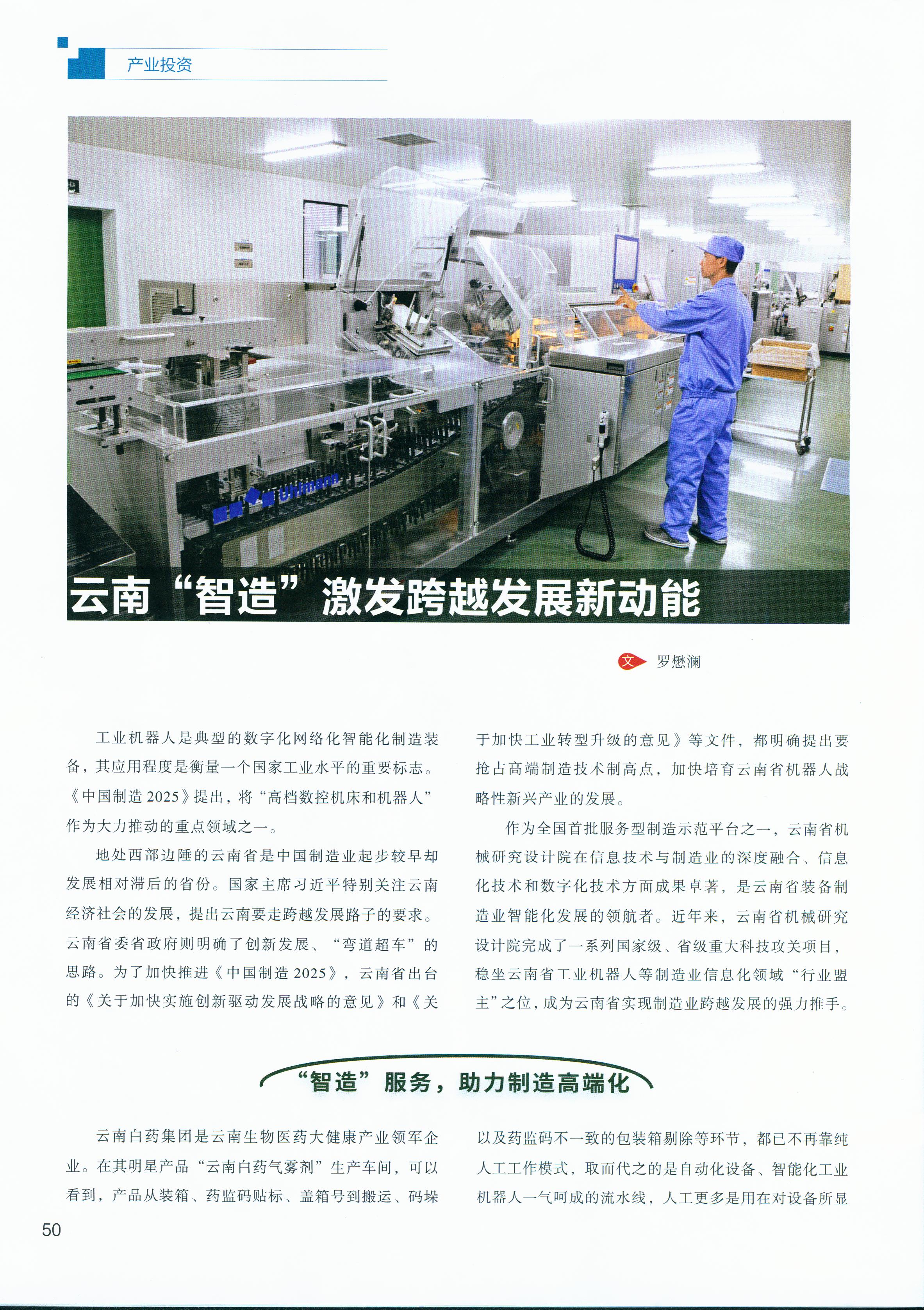 近日,作者观摩了云南生物医药大健康产业领军企业——云南白药集团生产区,在其明星产品“云南白药气雾剂”生产车间,产品从装箱、药监码贴标、盖箱号到搬运、码垛以及药监码不一致的包装箱剔除等环节,都已不再靠纯人工工作模式,取而代之的是自动化设备、智能化工业机器人一气呵成的流水线,人工更多是对设备所显示的产品数据适时监控和相关信息处理。据云南白药集团国家级技能大师范志伟介绍,云南白药集团引入云南省机械研究设计院研发的工业机器人,双方合作对云南白药气雾剂生产线后端进行智能化升级,使这条每年产值15亿元的生产线如虎添翼,以往需两条人工线一天的工作量,现在一台智能机器人轻松搞定。